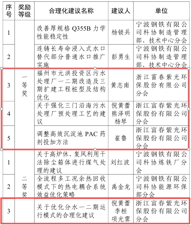 紫光科协分会广泛动员技术人员立足岗位开展实践创新,在本次活动中收集并推荐报送合理化建议14项,内容涉及工艺优化、设计优化、设备改造、工程优化、药剂投加等多个方面。据悉,杭钢科协本次评选活动共收到各分会推荐上报的合理化建议52条,评出一等奖5项、二等奖10项、三等奖12项,并授予三位同志“2024年杭钢科协合理化建议积极分子”荣誉称号。