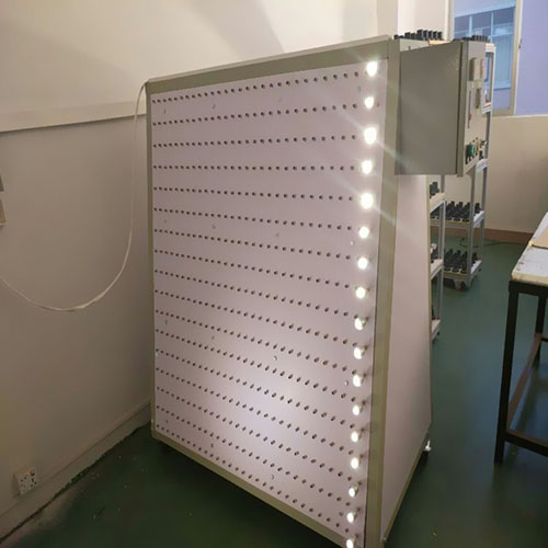 老化架总高度1400mm高,三层,每一层内空是400mm,地面到第一层高度为180mm,每层每边配置20个快速老化接头,双边配置,一层满载可老化灯具40个,主线采用4平方国标电线外加主线防水插头。