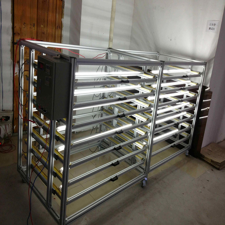 5.滑轨配置:采用1.2mm冷板折弯装置,经过高温喷漆处理,安装在支撑架上作为多种不同长短的日光灯进行通电老化,如下 【1.5m.1.2m.0.9m.0.6m的日光灯都可在本设备上使用】。