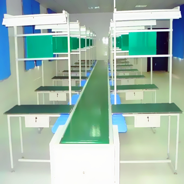 4.工作台;双边配长条式工作台,规格$ 400mm,台板为=15mm优质夹板制作,面贴防静胶皮,15mm/ T型胶条包边沿线体一路布置
